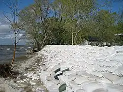 As a result of the record or near-record low precipitation levels combined with above average temperatures for the month of July, the lake peaked at a calculated wind eliminated level of 817.15 feet (249.07 m) for a period of time in mid to late July.[25] However, according to Government flood sheets, Lake Manitoba peaked at 817.7 feet (249.2 m) at the Westbourne gauge and 817.5 feet (249.2 m) at the less variable Steep Rock gauge respectively.[26] The flooding led to serious problems to cottagers who had already tried to prevent erosion and property damage through such methods as retaining walls, natural vegetation, rocks and rock cages, and some even resorted to moving their cottages back. These problems were not just localized to Twin Lakes Beach and also occurred on many parts of the lake. According to the Government of Manitoba Water Stewardship department, many areas around Twin Lakes Beach are not even above 814 feet (248 m) above sea level according to forecasted lake inundation maps released.[27] This led to major flooding in the area from the flooded Lake Francis from behind, as well as damage due to high winds, waves, and storms. A State of Emergency was declared in Woodlands and St. Laurent and cattle around the lake were evacuated. A sandbagging machine was assembled in St. Laurent and produced sandbags for use by cottagers and residents in both Woodlands and St. Laurent. Sandbags were also trucked in from the surplus stock from Winnipeg.