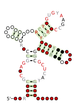 ![]() Consensus secondary structure and sequence conservation of Twister_sister_ribozyme | |