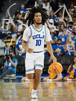 As a senior in 2022–23, Campbell was named to the 10-player midseason watch list for the Cousy Award.[22] He earned his third consecutive first-team All-Pac-12 selection,[23][24] and received honorable mention as an All-American from the Associated Press.[25] In the semifinals of the Pac-12 tournament, he scored 20 of his career-high 28 points in the second half in a win over Oregon.[26] UCLA advanced to the Sweet Sixteen of the 2023 NCAA tournament. After the season, he declared for the 2023 NBA draft, forgoing the extra year of eligibility granted due to the COVID-19 pandemic. Campbell ended his career ranked second in Bruins' history in career assists (655) behind Pooh Richardson (833). He had just 217 turnovers for a 3.02-to-1 assist-to-turnover ratio. He started all 133 of his games and averaged 11.1 points.[27]