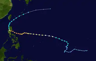 After moving erratically during its formative stages, Tropical Storm Betty accelerated towards the west-northwest as it passed south of Guam.[3] Late on October 29, the JMA designated Betty a severe tropical storm.[4] Twenty-four hours later, the JTWC upgraded Betty into a typhoon,[7] with the JMA doing the same at 00:00 UTC on October 31.[4] Twelve hours later, the JTWC raised the winds to 160 km/h (100 mph), equal to a low-end Category 2 hurricane on the United States-based Saffir-Simpson Hurricane Wind Scale (SSHWS).[2] On November 1, the Philippine Atmospheric, Geophysical and Astronomical Services Administration (PAGASA) also began to track the storm and assigned it with the local name Aring.[8] After turning due west,[3] Betty continued to intensify,[2] although a Hurricane Hunter penetration later on November 1 indicated no eyewall.[3] Early on November 2, synoptic data showed a shortwave trough moving off Asia. As such, the JTWC expected Betty to re-curve near the 125th meridian east. Instead, Typhoon Betty abruptly turned southwestward. On November 3, the trough moved quickly eastward north of the system, closing Betty's window for re-curvature.[3] Following the formation of an eye,[3] the JMA estimated that the typhoon peaked in intensity the next day, with winds of 185 km/h (115 mph) and a barometric pressure of 925 mbar (27.3 inHg).[4] Later that day, the JTWC estimated an intensity of 225 km/h (140 mph).[2]
