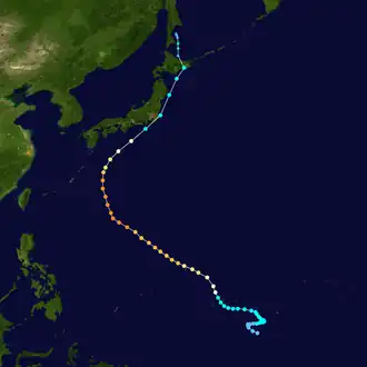 After affecting Guam, Chataan continued toward the northwest and gradually intensified. At 0000 UTC on July 8, the typhoon reached its peak intensity of 175 km/h (109 mph) 10-minute sustained) while located near the Japanese island of Okinotorishima.[6] The JTWC assessed that Chataan had reached its peak intensity of 240 km/h (150 mph) 1-minute sustained) about six hours earlier; on that basis, the agency classified the system as a super typhoon. On July 8, Chataan turned toward the north around the subtropical ridge while maintaining its peak winds for about 18 hours.[5] On July 9 the typhoon turned to the northeast, and late that day it weakened to a severe tropical storm. At around 1530 UTC on July 10, Chataan made landfall on the Bōsō Peninsula in Honshu with winds of about 100 km/h (62 mph) 10-minute sustained). The storm briefly moved offshore before making a second landfall on eastern Hokkaido at 1200 UTC on July 11;[6] this marked the first occasion of a July landfall on the island in 28 years.[7] A few hours later, Chataan became an extratropical cyclone in the Sea of Okhotsk, where the remnants stalled before dissipating on July 13 near Sakhalin.[6]