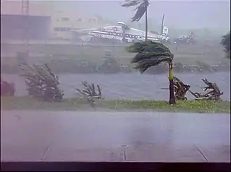 High winds caused damage across Guam, mostly to roofs and to poorly built or wooden structures.[3] A total of 1,996 houses were severely damaged or destroyed.[9] Better constructed homes fared well during the storm, and there was little window damage. The winds also downed power lines,[3] leaving an island-wide power outage. John F. Kennedy High School sustained damage to its football field and library.[9] The most significant effects were from the heavy rainfall, resulting in landslides in some areas and causing rivers to flow at above-normal rates; 14 stations reported either record flow rates or peak crests, including an island-wide peak crest of 8.55 m (28.1 ft) at the mouth of the Tolaeyuus River.[13] Two water gauges were destroyed during the storm.[14] Swollen rivers damaged roads, washed away trees, and caused erosion. The storm flooding contaminated Fena Lake, which provides water to the military base, for a few days.[3][13] In addition, 34 of the island's 110 water wells failed due to the storm. Flooding also destroyed a building and damaged the runway at Antonio B. Won Pat International Airport, and damaged a bridge near Inarajan.[9] A few palm trees fell due to the soil being loosened, either from heavy rains or high waves. Some of the downed trees struck cars, but the winds were not strong enough to overturn any vehicles. In the higher elevations of Guam, some areas experienced heavy crop damage due to strong winds; however, crop damage in general was less than expected,[3] estimated at $500,000. In Apra Harbor, high seas washed ashore or sank five boats, and a Navy barge spilled 397,000 litres (105,000 gallons) of oil. Overall, Chataan caused about $60 million in property damage on Guam, and there were 23 injuries, none of them serious.[9]