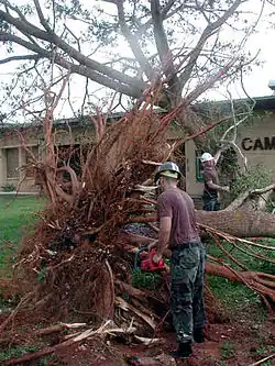 In the days after the storm, thousands of people on Guam evacuated to the 15 government shelters set up in schools across the island; the total reached 3,947 people on July 10.[9] The governor of Guam declared a state of emergency after the storm,[5] and on July 6 President Bush declared the island a major disaster area; this allocated federal funding to assist in removing debris and other emergency services.[45] A week later, the declaration was extended to include individual assistance for anyone who experienced damage from the storm.[46] The Fena Lake reservoir experienced excess silt deposit after excessive rainfall from Chataan, which prevented water distribution from the facility; on July 19 – fifteen days after the typhoon's landfall – water production resumed.[9] Before the facility reopened, the Guam Waterworks Authority distributed water to the island at differing times of the day to ration the limited supply.[47] However, by a month after the storm, residents were still required to boil water as a precaution.[48] About five days after Chataan struck Guam, Typhoon Halong affected the island and caused further power outages.[49] Some areas on the island remained without power for over a week, due to electric workers restoring the main transmission lines before fixing individual lines.[47] By July 19, 23% of those who lost power still were without electricity, mostly in outlying areas. By that date, trash collection was restored, and government-opened shelters were closed.[50] Later in July, flooding washed debris from Chataan and clogged two rivers.[9] The oil spill in Apra Harbor was cleaned at three of seven affected locations by August 19.[48] In the months after the storm, tourism decreased further after a decline that began after the September 11 attacks.[51] Ultimately, FEMA provided $73 million in assistance to the territory, including $10 million in housing checks to 5,947 people and $6.5 million worth of food stamps for 79,814 people. The agency provided $10 million for debris removal and rebuilding public buildings.[52] In December 2002, Typhoon Pongsona struck Guam and caused additional flooding and damage.[14] On August 7, President George W. Bush also declared Rota to be a disaster area, which provided funding for debris removal.[53]