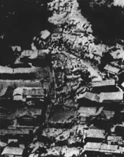 In the prefecture, Chita Peninsula and the eastern portion of Mikawa caused some widespread inundation damages due to the Yadagawa and Toyo River, which overflowed that day.[19] In the western half of the Owari Province, 4 fatalities were reported and over 9,267 households affected by flooding.[19] Eight railway lines also suffered damages.[19] Another river overflowed, submerging over 2,196 houses and 5,900 buildings and establishments.[20] The Mito River's left embankment was destroyed by strong currents, flooding wards, and establishments near the area.[21]