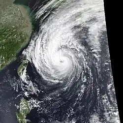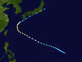 Typhoon Hattie, known in the Philippines as Typhoon Pasing, was the fifth tropical cyclone of a record-six to hit Japan during the 1990 Pacific typhoon season.[1][2] Hattie originated from an area of disturbed weather that developed within the Western Pacific monsoon trough towards the end of September. Tracking westward, the disturbance initially was slow to develop, although on September 30, the system was classified as a tropical depression. Following an improvement of its convective structure and an increase in associated convection, the depression was upgraded into Tropical Storm Hattie on October 1. Following the development of an eye, Hattie attained typhoon intensity on October 2. The typhoon continued to slowly deepen as its forward speed slowed. Despite a decrease in cloud top temperatures around the eye, Hattie was estimated to have attained peak intensity on October 5. After recurving to the north and then northeast, Hattie began to slowly weaken due to increased wind shear. On October 7, Hattie lost typhoon intensity, and after tracking directly over Tokyo, transitioned into an extratropical cyclone on the next day.
