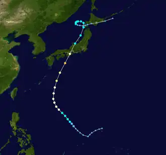 During the afternoon of September 16, a reconnaissance plane recorded flight-level winds of 185 km/h (115 mph). Around this time, surface winds were estimated to be the same, making Helen a Category 3 equivalent on the Saffir–Simpson Hurricane Scale. Later that day, the storm made landfall near Cape Kushimoto. In Shionomisaki Lighthouse, just west of where the center of Helen passed, a barometric pressure of 955 mbar (hPa; 28.26 inHg) was recorded, the lowest in relation to the storm. As the system neared Hokkaido, it slowed down and began a multi-day anticyclonic loop. During this period, it merged with an upper-level low and transitioned into an extratropical cyclone on September 19.[1] The remnants of Helen then tracked across southern Hokkaido before dissipating just east of the island on September 21.[2]
