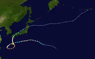 The interaction of a polar trough and easterly wave led to the genesis of an area of circulation southeast of Japan by August 11.[1]: 141 This system developed into a tropical storm, gaining the name Kathy the following day east of Iwo Jima based on ship observations.[2][3]: 76 Maintaining a west-northwestward heading, Kathy reached typhoon strength on August 13,[2] passing well south of Tokyo on approach towards the Ryukyu Islands.[4][5] The typhoon's winds peaked at 165 km/h (103 mph) on August 14 before tapering as the storm curved towards the west-southwest.[2][3]: 76 For the next four days, Kathy and nearby Typhoon Marie began a Fujiwhara interaction, causing both storms to rotate around one another, ending when Marie was absorbed into Kathy's circulation.[1]: 50 Between August 15–16, Kathy briefly fell to tropical storm intensity before regaining typhoon status southeast of Amami Ōshima.[2] During this period, an airplane investigating the storm identified multiple wind circulations at the center of Kathy and the storm's clouds were asymmetric.[6][1]: 146 The storm's west-southwest path brought the center across the Ryukyu Islands and near Okinawa on August 16 as Kathy began to execute a counterclockwise loop in its track. Two days later, Kathy's winds were estimated by the JTWC to be around 215 km/h (134 mph) near Minamidaitōjima. The typhoon's track made a smaller counterclockwise loop on August 20 before resuming north across the northern Ryukyu Islands. On August 23, Kathy made landfall on Kagoshima Prefecture with winds of 130 km/h (81 mph) and weakened to a tropical storm as it crossed the Seto Inland Sea and southern Honshu. It then curved to the northeast, briefly entering the Sea of Japan and crossing the Noto Peninsula before traversing northern Honshu and emerging into the northern Pacific.[2][3]: 76 On August 25, Kathy transitioned into an extratropical cyclone and continued northeast towards the Aleutian Islands before it was last in the Bering Strait on September 1.[2][3]: 76