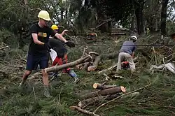 According to the catastrophe modeler Eqecat, the storm was likely to cause $1–3 billion (USD) in damage throughout the country.[31] However, as of September 3, officials have estimated that damage has reached 68.52 billion won (US$58.3 million).[25][27][32] In the wake of the storm, the Korean disaster agency stated that 29,000 government officials, soldiers and volunteers were working on clearing debris and restoring power.[28] By the evening of September 2, electricity had been restored to 98% of the households affected.[30] Roughly $22 million (USD) was set aside as relief money for residents affected by the storm. The National Tax Service decided to allow extra time on deadlines for people to recover.[33]