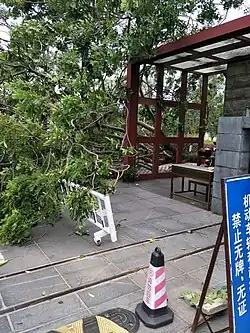 As Maria passed north of Taiwan, heavy rain and gusty winds impacted the island. Workplaces and schools were closed on July 10 and resumed operations on July 11. Services along the Taiwan High Speed Rail were interrupted by the adverse weather conditions.[29][30] The Forestry Bureau closed 14 national forest recreational areas from July 10 to 12.[31] A man in New Taipei City sustained fatal head injuries after losing his balance when inspecting his house.[32] Seven men and a woman were injured in northern Taiwan by falling branches. Strong winds caused 59,485 households to lose power, though the situation was mostly resolved by July 11. Agricultural damage in Taiwan was valued at NT$1.3 million (US$43,000).[33] The typhoon also eroded away part of Huaping Islet, causing its shape to now resemble a two-humped camel instead of a one-humped camel.[34]