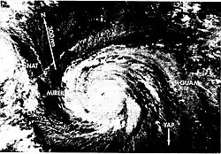 Only 12 hours after the JTWC issued the first warning, Mireille attained typhoon status at 12:00 UTC on September 16, and several hours later reached an initial peak intensity of 135 km/h (84 mph).[2][6] The small storm moved west-northwestward due to the influence of the subtropical ridge to the north. On September 17, the track shifted to the west-southwest, threatening Guam. The small typhoon turned more to the west, passing about 20 km (12 mi) north of Saipan on September 19, part of the Northern Marianas Islands north of Guam. For several days, Mireille failed to intensify due to wind shear from the larger Tropical Storm Luke to the north. After Luke weakened and progressed northward, Mireille was able to strengthen more gradually, as well as increase in size.[2] On September 22, the typhoon strengthened into a super typhoon, which is an unofficial category used by the JTWC for storms reaching 1‑minute winds of at least 240 km/h (150 mph), equivalent to a strong Category 4 hurricane on the SSHWS.[6] According to the JMA, Mireille attained 10‑minute winds of 185 km/h (115 mph) on September 23.[4]