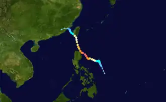 Nanmadol made landfall in China as a weak tropical cyclone bringing heavy rains, prompting local authorities to issue flood and landslide warnings.[83] Also, a female news reporter in China literally escaped death after an unusually large version of the Qiantang River tidal bore (known locally as the "Silver Dragon") amplified by Nanmadol's storm surge rose behind her during a live report.[84] Thousands of fishermen's livelihoods were at risks of being washed away. Evacuations were being carried out with local residents being taken to higher grounds.[85] On August 31, authorities in China reported that the total economic losses caused by Nanmadol in China were more than 44 million yuan (6.9 million U.S. dollars) as the storm destroyed 110 houses having more than 138,000 people evacuated.[86] In Putian City, Nanmadol claimed two lives, leaving four missing after very heavy torrential rains attributed to the storm. Bullet trains were slowed or stopped after the heavy damaged caused by Nanmadol's remnants to Fujian Province.[87] Also, the astronomical high tide coincided with Nanmadol's storm surge bringing unusually high tides which resulted in the increase of the likelihood of coastal flooding.[88]