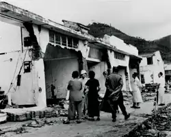 Typhoon Wanda routed in Hong Kong near Cheung Chau, to the right side of most parts of Hong Kong, so the strong wind blowing into Tolo Harbour made the sea level rise, therefore Sha Tin (area near Tolo Harbour) became the hardest hit.[5][6] Since a large number of people settled in squatter huts on low-lying coastal areas or precarious slopes and fishermen lived in fishing boats, it caused large casualties when the typhoon hit Hong Kong. Some survivors claim that the huge waves covered up their homes, sweeping the squatter huts and dumping homes in front of them. They had to run to the railway station in a higher sea level, but the flood was also deep in the knees.[7][8] It is estimated that one in five squatter huts was destroyed or damaged by the typhoon in Sha Tin, one of the gathering place of squatter huts in Hong Kong at that time. Approximately 3,000 squatter huts were damaged in total.[3] The roads were blocked by a large number of damaged squatter huts and the British army was needed to help rescue the residents and clean up the road.[9] The heavy flooding increased the difficulty of the rescue and clean up. Eight hundred and sixty-nine acres of farm land were flooded with sea water, over 30 percent (277 acres) were in Sha Tin, and almost 65 percent (179 acres) of the low-lying farm in Sha Tin were still affected two months later.[3] Shops and stores were also heavily damaged by the flood, many goods from stores were drifting on the street and it was difficult for them to reopen in the short term.[10]