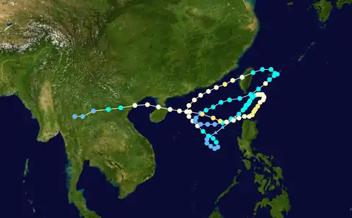 Vertical shear caused Wayne to weaken to a depression on August 25 according to the Joint Typhoon Warning Center, and August 26 according to the JMA,[1] as the cyclone began to rotate around the circulation of Vera to its north. Tropical Depression Wayne sped up to the northeast, but when Vera moved far enough away, Wayne drifted northeastward through the South China Sea, becoming a tropical storm again on August 27. Ridging to its north forced Wayne southward, where it again became a typhoon on August 30 according to the Joint Typhoon Warning Center, and August 31 according to the JMA. Wayne passed close to northern Luzon on September 2 as a 75 knots (139 km/h) typhoon, but turned back to the west. The JMA lowered Wayne back to a tropical storm on September 3 before restrengthening the cyclone back into a typhoon by early September 4.[1] On September 4 while moving quickly westward through the South China Sea, Wayne reached a peak of 85 knots (157 km/h) winds according to the Joint Typhoon Warning Center, or 70 knots (130 km/h) winds according to the JMA, before it weakened due to land interaction. It hit northern Hainan on September 5 as an 70 knots (130 km/h) typhoon. Its center passed just north of Haikou, where pressure fell to 970.1 hectopascals (28.65 inHg).[2] Wayne then entered the Gulf of Tonkin, and made its final landfall over Hà Nam Ninh in northern Vietnam later on that day, as a tropical storm. At a weather station in Nam Định City (Hà Nam Ninh), the sea-level atmospheric pressure was recorded at 967.4 hPa.[4] On September 6, Wayne dissipated over Vietnam/Laos border, after 85 JTWC advisories. The storm was one of the longest lasting Western Pacific tropical cyclones in recorded history.[3]