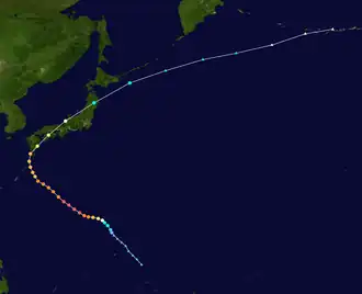 According to data from the Japan Meteorological Agency, Wilda began as a tropical storm east-southeast of Guam on September 16, marked by a large mass of clouds and associated rainbands.[2][3]: 141 The system tracked northwest over the Northern Mariana Islands and into the Philippine Sea two days later.[2] The Joint Typhoon Warning Center recognized the storm as a tropical cyclone on September 19 when it was located roughly 370 km (230 mi) northwest of Saipan and assessed Wilda to have strengthened into a typhoon later that day.[4]: 77 An eye emerged on Nimbus satellite imagery on September 20,[3]: 159 and on September 21, Wilda reached its peak intensity over the Philippine Sea with one-minute maximum sustained winds of 280 km/h (170 mph) as estimated by the JTWC and a minimum central pressure of 895 hPa (mbar; 26.43 inHg).[2] Based on data from the JMA, this was tied for lowest central pressure of any typhoon in 1964, along with Typhoon Sally.[1] Wilda slightly weakened following peak strength before curving northward and making landfall on Kagoshima on September 24; one-minute sustained winds three hours prior to landfall were estimated to be 185 km/h (115 mph).[2] The storm passed over Shikoku and southern Honshu before emerging into the Sea of Japan and curving northeast. Wilda made a final landfall on the western coast of northern Honshu on September 25 as a tropical storm, thereafter, departing Japan and quickly moving towards the central Aleutian Islands as a powerful extratropical cyclone.[2][4]: 77 The storm was last identified on September 27.[2]