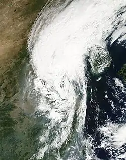 Not long after reaching its peak intensity, Wipha began to weaken as it started to interact with the high terrain of Taiwan.[3] Early on September 18, PAGASA issued their final advisory on Typhoon Goring as it left their area of responsibility.[5] Later that day, the center of the typhoon passed roughly 130 km/h (80 mi) north of Taipei, Taiwan.[6] Continued weakening took place as the storm neared landfall in Mainland China. Around 1800 UTC, the eye of Wipha crossed the Chinese coastline near Wenzhou with sustained winds of 140 km/h (87 mph) 10-minute sustained).[3][6] The JTWC assessed Wipha to have made landfall as a low-end Category 3 typhoon with winds of 185 km/h (115 mph) 1-minute sustained).[4][6] Rapid weakening took place as the storm moved further inland.[6] The JTWC issued their final advisory on Wipha during the afternoon of September 19 as they classified the system as an extratropical cyclone.[4] However, the JMA continued to monitor the system as a tropical depression until September 20. At this time, the remnants of Wipha had entered the Yellow Sea and accelerated northeastward towards the Korean Peninsula. The extratropical remnants of Wipha persisted for several more hours before dissipating off the coast of North Korea that afternoon.[3]