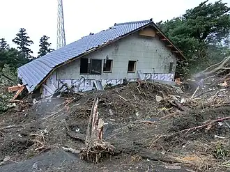 During October 15, the JMA issued a mudslide warning for the volcanic islands of Izu-Oshima and Miyakejima, which was subsequently relayed to the Tokyo Metropolitan government which sent a fax transmission to the affected local governments.[16] However, while the Miyakejima government got the warning and advised residents to evacuate, the staff in the Izu-Oshima town office had left for the day with only a security guard left on duty.[16] As a result, local officials did not see the advisory until around midnight local time, by which time they had decided it was too dangerous, to ask residents to leave their homes and did not issue an evacuation order.[16] During the next day as Wipha moved towards the north-northwest it caused heavy rain in the town of Oshima, where an hourly rainfall total of 100 mm (3.9 in) and a 24-hour total of 824 mm (32.4 in) were recorded.[17] As a result of the rainfall several landslides, debris flows and slope failures were recorded in the thin volcanic ash layer of hillside surfaces, which resulted in at least 41 fatalities.[17] Damage in the island reached ¥40 billion (US$404.8 million).[18]