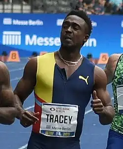 Tyquendo Tracey (born June 10, 1993 in Trelawny, Jamaica) is a Jamaican professional athlete competing in the sprints. He is the 2018 Jamaican champion in the 100 m and the 2018 NACAC champion, setting the championship record of 10.03 s in the process. Just three weeks earlier, he became the 135th man and 20th Jamaican to break the 10-second barrier by running 9.96 s in a qualifying heat at the London Anniversary Games on July 21, 2018. Later that same day, he did it a second time, running 9.98 s in the finals.[3] Tracey later anchored the Americas team to victory in the 4 × 100 m relay at the 2018 Continental Cup.