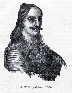 Zigouris Tzavelas[2] he was the brother of Fotos Tzevelas. When he returned from Corfu in 1820, he fought alongside Ali Pasha against the troops of Hurshid Pasha. After the collapse of Ali and the new fall of Souli, he went down to Central Greece and took part in the Revolution at the head of the Souliotes. He was killed in the battle of Kaliakouda in Evrytania in 1823, fighting the Turks.