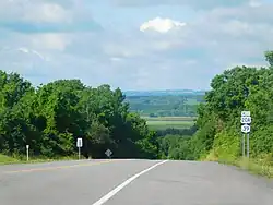 Past the NY 19 junction, US 20A continues east along Buffalo Street to the eastern edge of the village and the valley, where the route turns a full 90 degrees to the north to climb the side of the Oatka Valley. The route ascends approximately 300 feet (91 m),[6] passing under the Rochester and Southern Railroad (RSR)—which runs along the foot of the gorge—before exiting the valley and returning to an east–west alignment as it heads toward Perry and points east. All oversize trucks are prohibited from using the section of US 20A between NY 19 and Minor Road at the top of the valley due to the steep grade of the hill and the sharp curve at the bottom.[7]