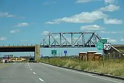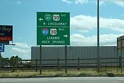 U.S. Highway 30 (US 30) is part of the United States Numbered Highway System that runs from Astoria, Oregon, to Atlantic City, New Jersey. Within the U.S. state of Wyoming, it runs from Kemmerer to Pine Bluffs by way of Rock Springs, Laramie, and Cheyenne. The route runs mostly along the historic Lincoln Highway.[2] It parallels Interstate 80 (I-80) throughout the state, and the two highways intersect and share three concurrencies.[3]