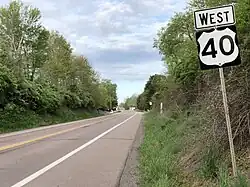 U.S. Route 40 enters Pennsylvania in rural western Washington County near West Alexander. It travels to the east-northeast paralleling I-70 through Claysville on to Washington. While in Washington, the largest city on US 40 in Pennsylvania, it is named Chestnut St. Exit 15 on I-70 is signed for Chestnut St. Route 40 leaves Chestnut St. and joins PA 18, becoming Jefferson Ave. After two blocks of concurrency with PA 18, it leaves PA 18 and joins US 19. US 40/US 19 then leaves Washington as Maiden St. US 19 leaves Route 40 in Laboratory before it intersects I-79 at exit 33. Now heading east-southeast, US 40 makes its way toward Brownsville. Route 40 passes through Scenery Hill and Beallsville before reaching PA 43/PA 88 at a full cloverleaf interchange in Centerville. US 40 then crosses the Monongahela River via the Lane Bane Bridge, leaving Washington County after spending nearly 40 miles (64 km) in the county.[2]