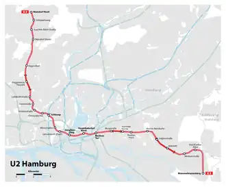 The U2 is a line of the Hamburg U-Bahn which has a length of 24.543 kilometres (15.25 mi). It serves 25 stations. The line opened in 1913. It starts in Niendorf Nord and leads via the city center at Hauptbahnhof Nord to Mümmelmannsberg.[1]