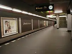 Beyond the Gesundbrunnen station, the line continues under Badstraße. At the junction with Pankstraße a station with the same name was constructed. The Pankstraße U-Bahn station was constructed to be usable as a shelter (e.g. in case of war). To this end Pankstraße has sanitary facilities, an emergency kitchen, a filtered ventilation system, et c. In an emergency it can shelter 3,339 people. The additional costs for these facilities were paid by the Federal Ministry of Finance. The walls are tiled in brown and the columns clad in aluminium sheeting. One curiosity remains at Pankstraße station: the silver letters affixed to the walls spell the name as "Pankstrasse", transliterating the eszett and ignoring the correct German spelling ("Pankstraße").