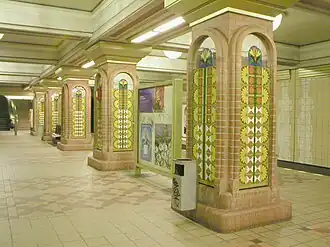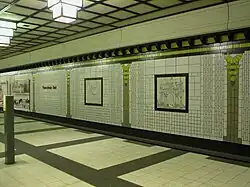 The Residenzstraße station, intended to be reminiscent of the Berlin Imperial palace, is decorated with plans of the now destroyed Stadtschloß. The supporting pillars are decorated in very bright colours and probably intended to evoke the rich carpets of the residence. Paracelsus-Bad station was designed to evoke associations with the nearby swimming baths. In addition there are pictures on the wall, one of which shows the doctor and philosopher Paracelsus (Theophrastus Bombastus von Hohenheim).