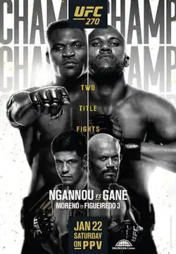 - ^ Brent Brookhouse (2021-10-23). "UFC 270 fight card: Francis Ngannou vs. Ciryl Gane, Brandon Moreno vs. Deiveson Figueiredo 3 set to headline". cbssports.com. Retrieved 2021-10-24.