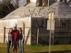 The UFO Welcome Center was a tourist curiosity located in Bowman, South Carolina, United States, built in the back yard of Jody Pendarvis. It consisted of a 46-foot-wide flying saucer (14 m) built out of wood, fiberglass, and plastic.[1] The structure, entered via a powered ramp, was mounted on four columns, designed to raise and lower with motors. In addition to a labyrinth of mechanical and electronic salvage parts, the saucer was furnished with a bed, satellite television, air conditioning, toilet, and shower. Pendarvis envisioned himself as being an ambassador to aliens and wanted to provide a facility where they could rest after a long journey on UFOs.