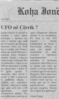 July 13, 1993 article from Koha Jonë newspaper talking about the 1993 Cërrik UFO incident and 1963 Kallamishtëz UFO incident.