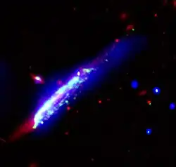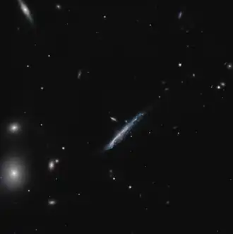UGC 6697 has a particular morphology. It is considered an edge-on galaxy and such has a long tidal tail with blue color and low surface brightness which stretches out northwest.[7] This is in fact caused by dynamic pressure. It occurs when the galaxy plunges forward into the cluster, the pressure acts on the galaxy and penetrates through high speeds causing intracluster medium. In the process, the cooler gas is compressed and expelled from the galaxy's edge thus forming a trail.[8] The gas trail extends 100 kpc which measures 326,000 light-years in diameter.[9] In the long run, the dynamic pressure will eventually strip the gas from the galaxy, rending it an anemic galaxy.[8][10]