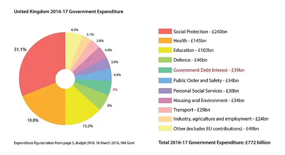 The public debt increases or decreases as a result of the annual budget deficit or surplus. The British government budget deficit or surplus is the cash difference between government receipts and spending. The British government debt is rising due to a gap between revenue and expenditure. Total government revenue in the fiscal year 2015/16 was projected to be £673 billion, whereas total expenditure was estimated at £742 billion. Therefore, the total deficit was £69 billion. This represented a rate of borrowing of a little over £1.3 billion per week.