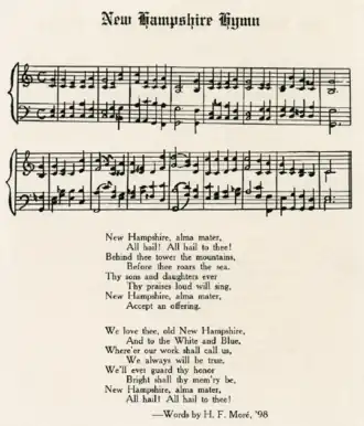 The "UNH Alma Mater" is the official alma mater of the University of New Hampshire in Durham, New Hampshire. The lyrics to the song were written by Herbert Fisher Moore, an 1898 graduate of the school,[1][2] and are sung to the tune "Lancashire" (also known as "Lead On, O King Eternal")[3] by Henry Smart.[4]