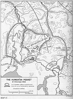 On 11 October, the 27th British Commonwealth Brigade, with tanks of B Company, 6th Medium Tank Battalion, in support, had crossed the Imjin River and followed the 5th Cavalry Regiment northeast out of Kaesong. Gay's plan was for the brigade to move northwest through the mountains for a close-in envelopment of Kumch'on. His aerial observer, hitherto very reliable, wrongly reported that the roads were as shown on the maps and that the plan was feasible. The road taken by the British, little more than a cart track, dead-ended in the mountains. The Middlesex Battalion got lost on this trail, turned back, and tried another. Despite an arduous effort in the mountains, the British troops never got into the fight for Kumch'on. While the British were crossing the Imjin, the ROK 1st Division crossed it at Korangp'o-ri at dawn on the 11th, eastward of the 1st Cavalry Division, and attacked northwest on a road that converged with the one taken by the 5th Cavalry Regiment. The 5th Cavalry in the late afternoon of 12 October was engaged in a firefight with the KPA at the objective crossroads when advance elements of the ROK 1st Division arrived there from the southeast. In a conference on the spot Colonel Crombez and General Paik Sun-yup, the ROK division commander, agreed that the 5th Cavalry would have precedence on the road until Crombez' troops turned west, 8 km (5 mi) northward on a lateral road leading into Kumch'on. The ROK 1st Division, following behind the 5th Cavalry, would then continue its attack north to Sibyon-ni where it would veer northwest toward Pyongyang. Tanks of C Company, 6th Medium Tank Battalion, supported the ROK 1st Division. Of the three regimental attack forces, the 7th Cavalry Regiment on the division left flank had the most difficult assignment, and in fact Gay and his staff expected it to accomplish little. The regiment had to cross the wide Yesong River against defending KPA forces before it could turn north as the lefthand column in the Kumch'on Pocket maneuver. Since all of I Corps' bridging troops and equipment were committed to establishing bridges across the Imjin River at Munsan-ni to support the main effort northward, river crossing support could not be supplied for the 7th Cavalry Regiment at the Yesong River.[48]