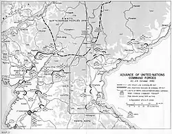 North Korea invaded South Korea at the end of June 1950 in Operation Pokpung. By late-July, South Korea was reduced to the southeast tip of the peninsula around Pusan, held by the United Nations Command (UNC) forces, mainly the US Eighth Army, and the ROK. The Korean People's Army (KPA) offensive on the Pusan perimeter in August and September failed to break through;[3] the KPA had suffered heavy casualties since the start of the war and was overextended. By September, the KPA was attacking Pusan with 70,000 troops, while the UNC had 140,000 troops with materiel superiority.[4] The US estimated that there were 90,000 KPA troops in South Korea.[5] In mid-September, US X Corps, composed of US 1st Marine Division and US 7th Infantry Division,[6] made a surprise landing at Inchon in the North Korean rear west of Seoul;[7] UNC commander General Douglas MacArthur accompanied the landing.[8] Shortly afterward, the UNC and ROK broke out of Pusan.[9] The KPA began a general retreat from South Korea to avoid encirclement,[10] giving little resistance to their rapidly advancing pursuers from Pusan. Eighth Army advanced in the west and linked up with X Corps at Osan on 26 September. The ROK advanced in the east[11] and reached the 38th parallel by the end of the month.[12]