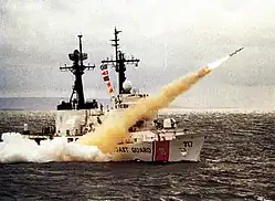 USCGC Mellon launching an RGM-84 Harpoon missile in 1990.