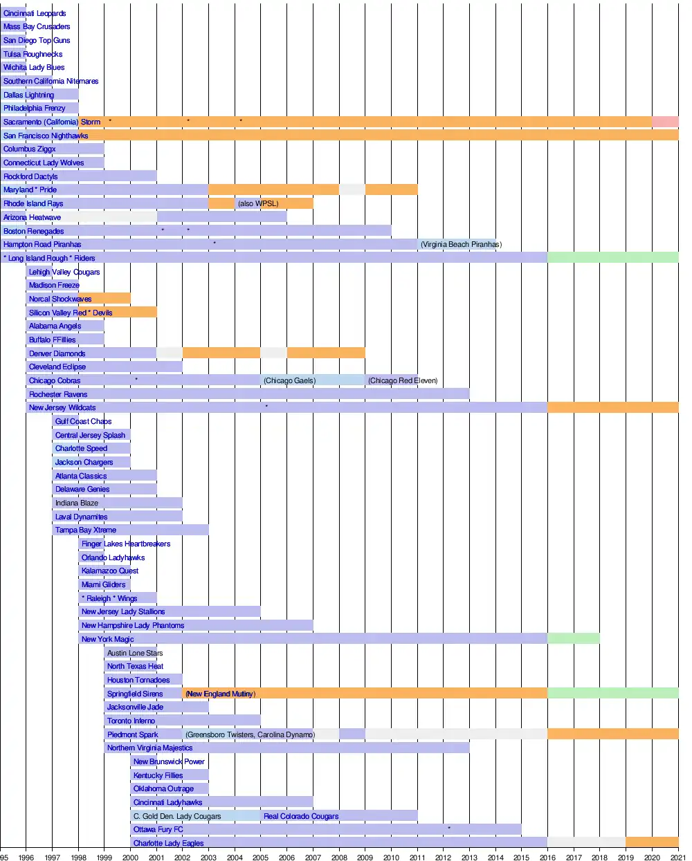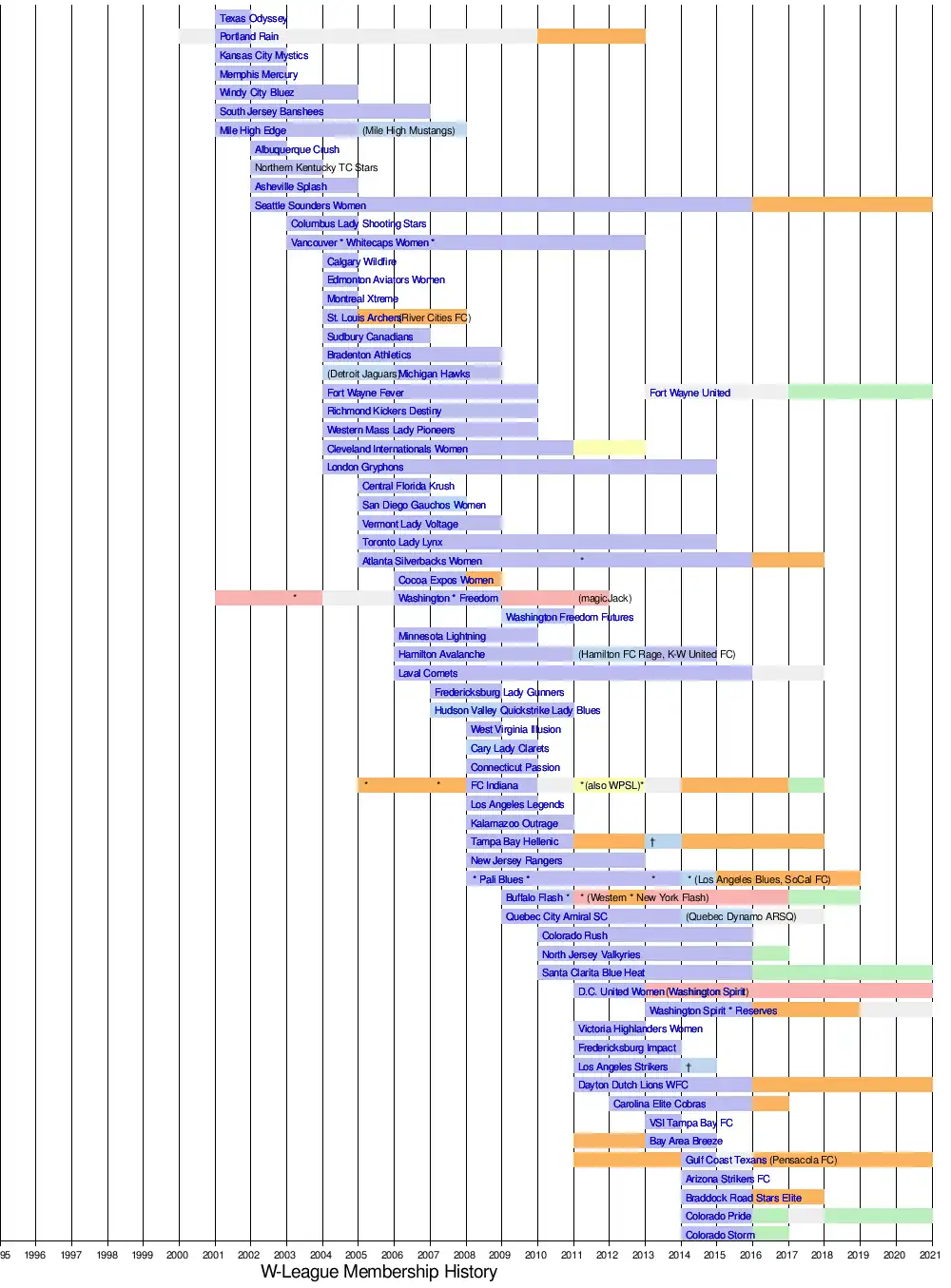 W-League member(alt.name/merger†) WUSA / WPS / NWSL WPSL-WLS-UWS inactive / exhibition / other (*) indicates championship