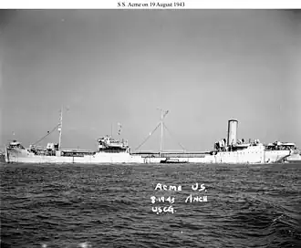 ![]() SS Acme at anchor, 19 August 1943, location unknown, shortly before being acquired by the USN.