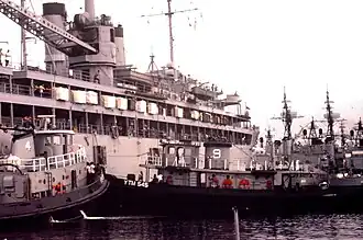 ![]() Naval Station Mayport, Florida, tugs Accohanoc (YTM-545) and Tomahawk, alongside Yosemite 1973. Note the two destroyers in the background, one of which is Charles R. Ware.