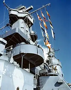Alabama received a series of modifications through her wartime career, consisting primarily of additions to the anti-aircraft battery and various types of radar sets. The first addition was the installation of SC air search radar in 1941, fitted in the foremast, which was later replaced with an SK type set. At the same time, an SG surface search radar was installed on the forward superstructure; a second SG set was added to the main mast after experiences during the Guadalcanal campaign in 1942. In 1943, she received a Mark 3 fire-control radar, mounted on her conning tower to assist in the direction of her main battery guns. The Mark 3 was quickly replaced with more modern Mark 8 fire-control radar, and Mark 4 radars for the secondary battery guns. She later received Mark 12/22 sets in place of the Mark 4s. Alabama also received a TDY jammer. In 1945, her traditional spotting scopes were replaced with Mark 27 microwave radar sets.[4]