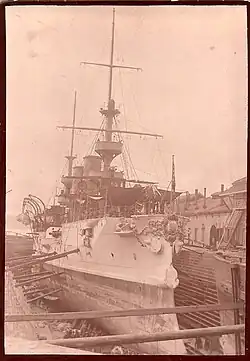 Albany was originally armed with six 6"/50 caliber (152 mm) guns and four 4.7"/50 caliber (120 mm) guns. These were British-made export-model guns built by Elswick Ordnance Company, a subsidiary of Armstrong. These guns were unique in the US Navy to Albany and her sister New Orleans, and they were designated as "6"/50 caliber Mark 5 Armstrong guns" and "4.7"/50 caliber Mark 3 Armstrong guns".[17][18] To reduce supply difficulties, during refits at the Cavite Navy Yard in the Philippines in 1903, both ships had their 4.7-inch guns replaced with standard 5-inch (127 mm)/50 caliber Mark 5 guns; the 6-inch guns were replaced with 5-inch guns in 1907.[19] Their torpedo tubes were also removed in the 1903 refits.[20] At least some of the guns from these ships were emplaced in the Grande Island/Subic Bay area 1907-1910 and operated by the United States Marine Corps until the Coast Artillery Corps' modern defenses centered on Fort Wint were completed.[21][22] During World War I the 5-inch guns were reduced from ten to eight and a 3"/50 caliber (76 mm) anti-aircraft gun was added. Two 4.7-inch guns (one from each ship of the class) are preserved at the Kane County, Illinois Soldier and Sailor Monument at the former courthouse in Geneva, Illinois.[23] The gun from Albany was the No. 5 gun, presented on 1 April 1925.