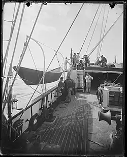 Albatross was decommissioned at Woods Hole on the morning of 29 October 1921. Minus her equipment, instruments, and library, she was sold on 16 June 1924 to Thomas Butler and Co. of Boston, who then refitted her "as closely possible along her old lines" as a school ship. In 1927 her owner was a James A Ross and she was registered in Boston.[2] Fitted out as a training ship for "nautical students or cadets," she left Boston on 12 July 1927 under the auspices of the American Nautical School, Inc., with 119 pupils on board, bound for European waters. The students, however, departed the ship at a succession of ports on the ship's final voyage — Cork, Le Havre, and Amsterdam — with the result that only 21 remained on board when she arrived at Hamburg. The ship's crew insisted that she be auctioned off to satisfy their demand for wages. On 18 October of the same year, the ship was reportedly tied up at Hamburg, "under attachment for indebtedness." She was sold at auction in Hamburg for $10,800,[8] but her ultimate fate remains unknown.