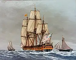 Captain Elisha Hinman became Alfred's commanding officer in May 1777. She did not get underway until August 22 when she sailed for France with USS Raleigh to obtain military supplies. En route, they captured four small prizes, including brig "Sally" on September 28.[4] They reached L'Orient on October 6, and on December 29 sailed for America. They proceeded via the coast of Africa, where they took a small sloop, and then headed for the West Indies, hoping to add to their score before turning northward for home. On March 9, 1778, near Barbados, they encountered British warships HMS Ariadne and HMS Ceres.[5] When the American ships attempted to flee, Alfred fell behind her faster consort. Shortly after noon the British men-of-war caught up with Alfred and forced her to surrender after a half an hour's battle.