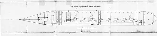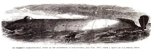In the autumn of 1861, the Union Navy asked the firm of Neafie & Levy to construct a small submersible ship designed by de Villeroi, who also acted as a supervisor during the first phase of the construction. The boat was about 47 feet (14 m) long, with a beam of 4 feet 8 inches (1.42 m) and height of 5 feet 6 inches (1.68 m).[3] "It was made of iron, with the upper part pierced for small circular plates of glass, for light, and in it were several water tight compartments". She was designed to carry 18 men. For propulsion, she was equipped with 16 hand-powered paddles protruding from the sides. On July 3, 1862, the Washington Navy Yard had the paddles replaced by a hand-cranked propeller, which improved its speed to about four knots.[4] Air was supplied from the surface by two tubes with floats, connected to an air pump located inside the submarine; it was the first operational submarine to have an air purifying system.[5][3] The boat had a forward airlock, and was the first operational submarine with the capability for a diver to leave and return while both remained submerged.[5][3] Divers could affix mines to a target, then return and detonate them by connecting the mine's insulated copper wire to a battery inside the vessel.[6]