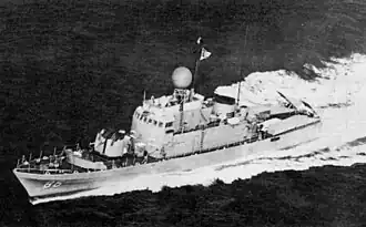The gunboat's service in 1973 was much like that which she had performed during her last three months of 1972. Highlights during the first six months were: an amphibious exercise at the Monte Romano Training Anchorage from 24 to 29 January and a visit to Monaco during the following week; "National Week XV" Exercise from 19 to 24 February; towing ITASS sonic test device late in February; an amphibious exercise at Portoscuso, Sardinia, and a visit to Bizerte, Tunisia, in April; a missile tracking exercise at Souda Bay at the end of May, NATO Exercise "Dawn Patrol 73" in June; and bilateral operations with Greek fast patrol boats which continued from 21 July to 10 August. During the latter half of the year, she took part in international Operation Zeus in the vicinity of Thasos island, Greece, from 21 to 29 August and NATO Exercise "Deep Furrow 73" from 20 to 30 September, before firing a missile off Crete on 1 October. This shot scored a direct hit on a Mk 35 SEPTAR target boat and was the first successful firing in the Mediterranean of the telemetered standard surface-to-surface missile system.[4]