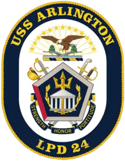 USS Arlington (LPD-24), a San Antonio-class amphibious transport dock, is the third ship of the United States Navy to be named for Arlington County, Virginia, the location of the Pentagon and the crash site of American Airlines Flight 77 during the terrorist attacks on 11 September 2001. Like her sister ships, USS New York and Somerset, she is named in commemoration of the attacks.[4] Steel taken from the Pentagon after the attacks is displayed aboard in the ship's museum.[5]
