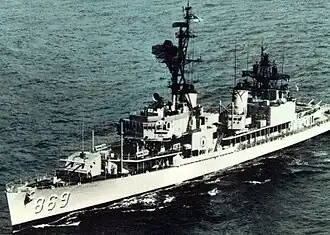USS Arnold J. Isbell (DD-869), a Gearing-class destroyer, was the only ship of the United States Navy to be named for Arnold J. Isbell, an aircraft carrier captain during World War II. The ship was laid down on 14 March 1945 at Staten Island, New York, by Bethlehem Mariners Harbor, launched on 6 August 1945 and commissioned on 5 January 1946. Constructed too late to see action in World War II, the vessel initially served as a training ship with the United States Atlantic Fleet, before transferring to the Pacific and deploying to Korea during the Korean War and off the Vietnam coast during the Vietnam War. In 1972 Arnold J. Isbell was made part of the reserve training fleet and in 1974, sold to Greece where the ship was renamed Satchouris and served with the Hellenic Navy until being sold for scrap in 2002.