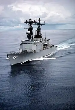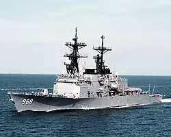 USS Arthur W. Radford (DD-968) was a Spruance-class destroyer in the United States Navy. She was named for Admiral Arthur W. Radford USN (1896–1973), the first naval officer to be Chairman of the Joint Chiefs of Staff. She was decommissioned on 18 March 2003 after serving for 26 years,[3] and on 10 August 2011 her hull was scuttled off the coast of Delaware to form part of an artificial reef.