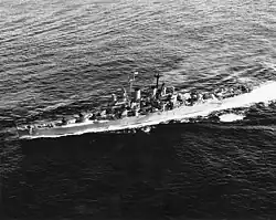 Atlanta served in the defensive screen for the task force's aircraft carriers, which operated off Okinawa from 22 to 27 May; the carriers repeatedly struck Japanese positions in the area to prepare for the imminent invasion of Okinawa.[4] While cruising at sea on 5 June, the fleet was struck by a major typhoon that damaged most of the ships, including Atlanta.[5] Atlanta was detached on 13 June and sent to San Pedro Bay in the Philippines for periodic maintenance. She arrived there the following day, and the work lasted through the end of the month. She got underway on 1 July to rejoin the task force, which had by that time passed to 3rd Fleet and had been re-numbered as Task Force 38.[4] Atlanta was assigned to the subordinate unit, Task Group 38.1, once again serving in the screen for the carriers. At that time, the unit consisted five carriers, three fast battleships, four other cruisers, and several destroyers.[6] The carriers conducted a series of strikes on the Japanese Home Islands over the following weeks, and Atlanta took part in several shore bombardments during this period.[4]
